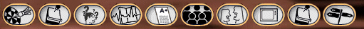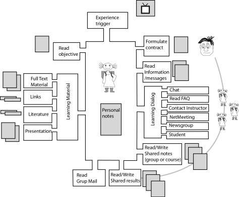 der ikonene fra venstre mot høyre står for: Klikk på en av ikonene bringer opp et eget vindu med innhold. Innholdet kan lenke til web-sider utenom selve databasen. På mange måter er dette en avbildning av den markedsmetaforen som ble brukt som diskusjonsgrunnlag, og i noen grad som designgrunnlag. Den store utfordringen i designet har vært å finne en form på arbeidsområdet. Valget er en "uendelig" skriverull som akkumulerer notater, helt til brukeren sletter hele eller deler av rullen. Websiden for den enkelte kursmodul, sett fra studentens side, er i grove trekk organisert slik: