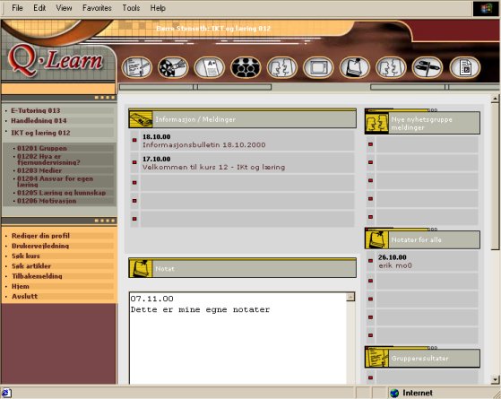 Prosjektet har fra starten av hatt problembasert læring som en grunnide. En av årsakene er at kursene i stor grad skal fange opp kursdeltagernes egne problemstillinger i arbeidssituasjonen og kursene skal gi mulighet for å bearbeide disse. Modellen som er beskrevet i denne artikkelen er forsøkt benyttet som designgrunnlag for kursutviklingen. Modellen er bearbeidet på to designseminarer med deltagelse av alle prosjektgruppene med kursansvar. Det vil bli utarbeidet evalueringsmateriale både når det gjelder kursformene og sammenhengen mellom kurs og leveringsteknologi. Denne artikkelen vil bli oppdaert med evaluering på et senere tidspunkt. Firmaet iPares har hatt jobben med å implementere kursportalen. Løsningen er basert på en database der det er mulig å legge inn materiale fra et web-grensesnitt. I skrivende stund, september 2000, er arbeidet med å legge inn kursmateriell igang. Kursene har en felles portal: http://q-learn.kau.se/index.htm . Selve kursrommet, arbeidsplassen innefor et kurs ser slik ut, forminsket |