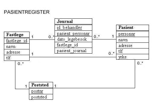 Oppgaver om RelasjonsalgebraSom grunnlag for denne oppgaver ligger "et litt større pasientregister". Se på uml-modellen før du setter i gang. Hva listes ut her?Skriv relasjonsalgebra for å gjøre følgende: